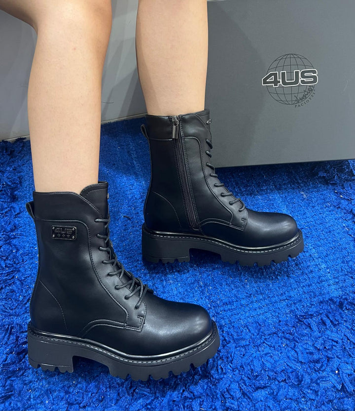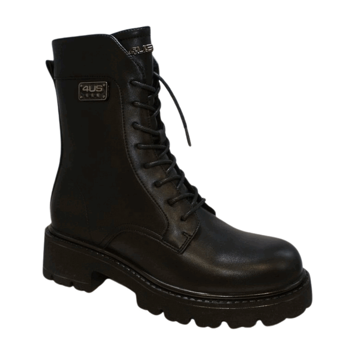 Anfibio donna 4US by Cesare Paciotti in ecopelle total black con placchetta logo smaltata. Calza facile posteriore, mini logo metallico sulla linguetta. Allacciatura frontale e zip sul laterale interno, sottopiede morbido in pelle. Fondo gomma, battistrada dentellato con tacco separato altezza 5 cm.
