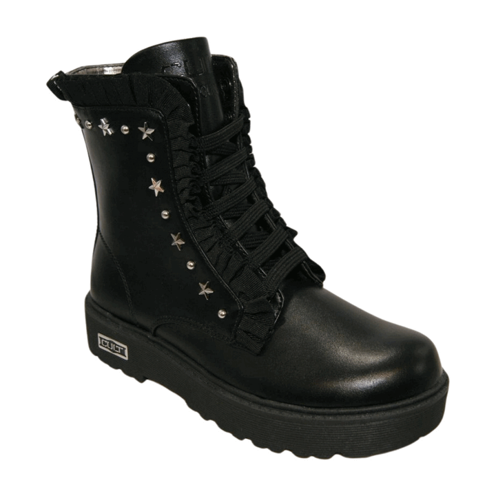 Anfibio donna Cult Young in ecopelle total black con borchie e rouge. Chiusura con lacci piatti in cotone in tinta e zip sul laterale interno. Calza facile posteriore logato, sottopiede morbido in pelle. Fondo gomma platform logato, battistrada dentellato altezza 3.5 cm