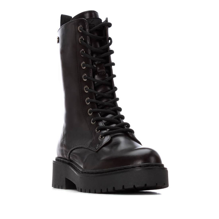 Anfibio donna xti in ecopelle bordeaux. Chiusura con allacciatura frontale e zip sul laterale interno. Calza facile posteriore, placchetta gommata con logo sulla linguetta. Fondo gomma con tacco separato altezza 4.5 cm