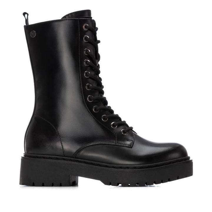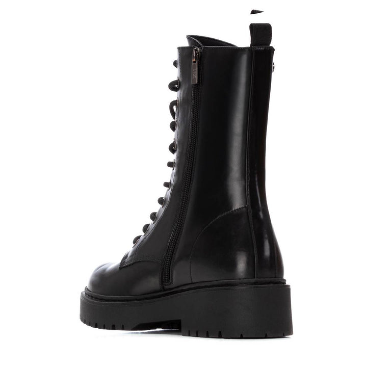 Anfibio donna xti in ecopelle nero. Chiusura con allacciatura frontale e zip sul laterale interno. Calza facile posteriore, placchetta gommata con logo sulla linguetta. Fondo gomma con tacco separato altezza 4.5 cm