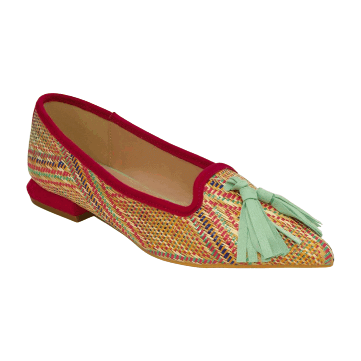 Ballerina con punta Azarey fucsia in tessuto intrecciato multicolor e nappine verde acqua. Plantare in pelle comfort foam, fondo gomma con tacco a blocchetto altezza 2.5 cm