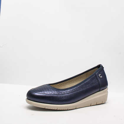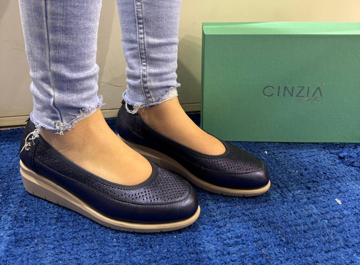 Ballerina Cinzia Soft in pelle laserata blu effetto lamé. Sottopiede in pelle memory foam, fondo zeppa in gomma altezza 4 cm.
