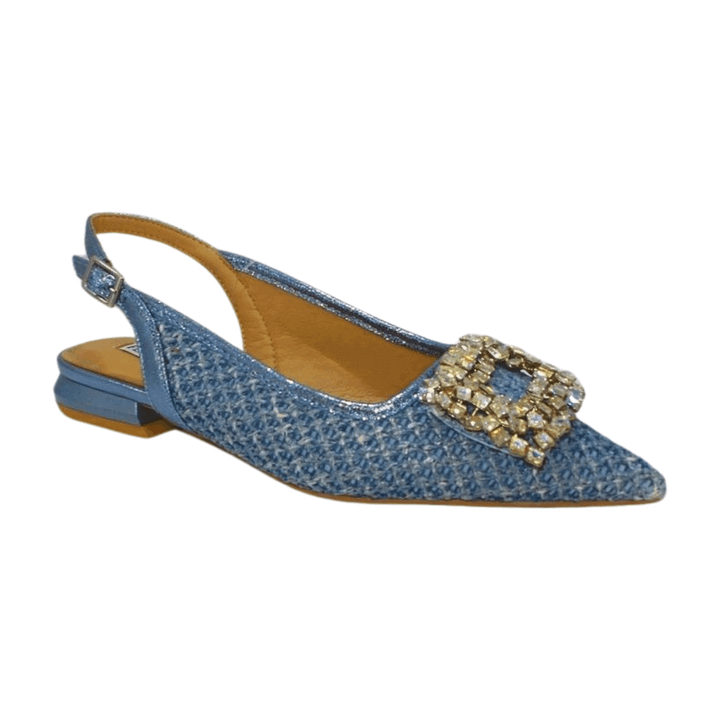 Slingback donna Ferré in poliuretano azzurro cielo con maxi applicazione gioiello sulla punta. Chiusura con fibbia regolabile, plantare in pelle. Fondo gomma con tacco a blocchetto altezza 3 cm.