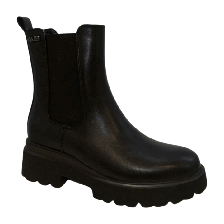 Beatles donna 4US by Cesare Paciotti in ecopelle total black con inserti elastici laterali e calza facile posteriore. Mini logo metallico laterale, sottopiede morbido in pelle. Fondo gomma, battistrada dentellato con tacco separato altezza 6 cm.