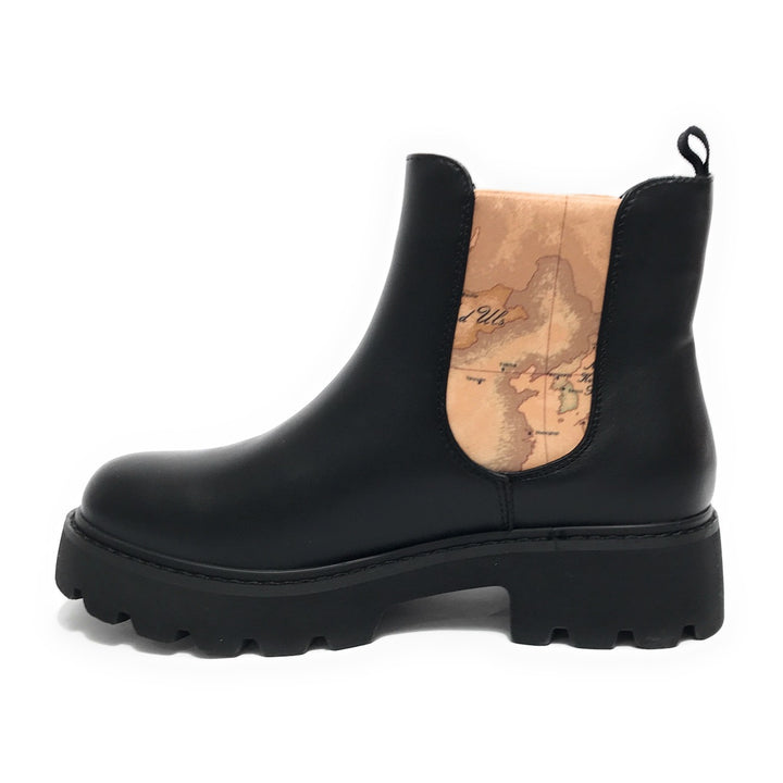 Beatles donna Alviero Martini 1ᴬ Classe in ecopelle nera con inserto elastico laterale e dettaglio geo classic. Calza facile posteriore, da infilare a calza. Fondo gomma con battistrada dentellato e tacco separato altezza 4 cm.