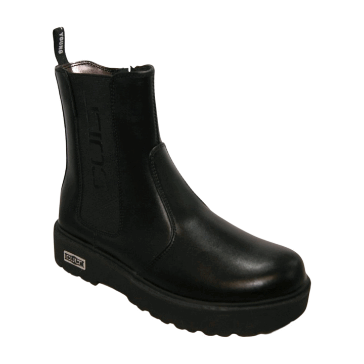 Beatles donna Cult Young in ecopelle total black con inserto elastico logato laterale e calza facile posteriore logato. Chiusura con zip sul laterale interno, sottopiede morbido in pelle. Fondo gomma platform logato, battistrada dentellato con tacco separato altezza 3.5 cm