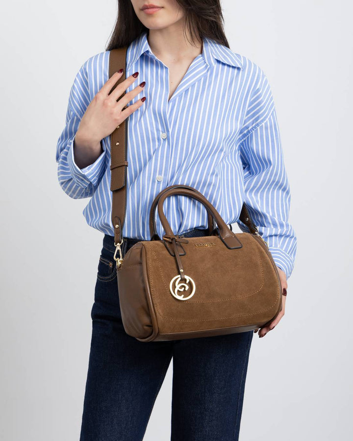 Borsa a mano da donna Carmela modello bauletto in camoscio. Chiusura scomparto principale con zip, doppia maniglia. Tracolla regolabile opzionale inclusa.