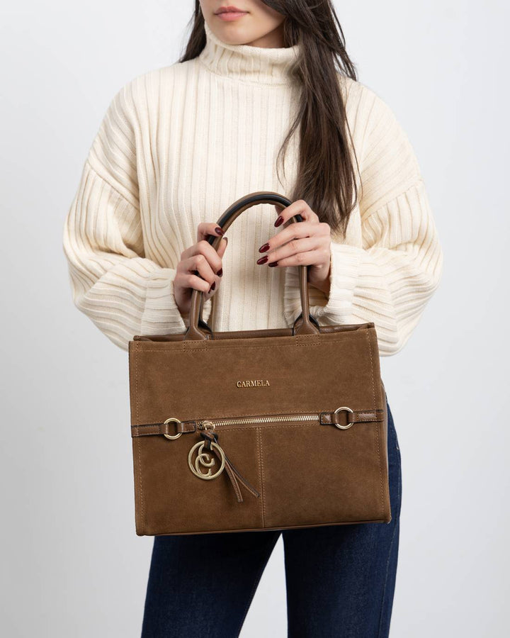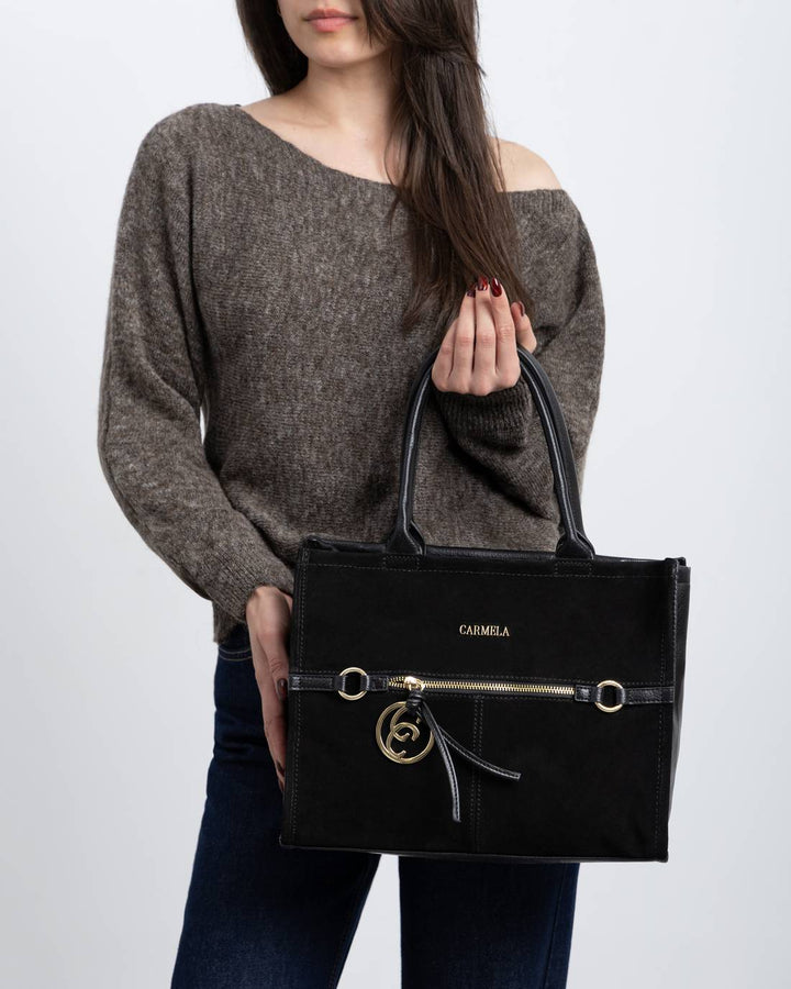 Borsa a mano da donna Carmela modello tote in pelle e camoscio. Chiusura scomparto principale con zip e tasche esterne con cerniera. Doppia maniglia, tracolla regolabile opzionale inclusa.