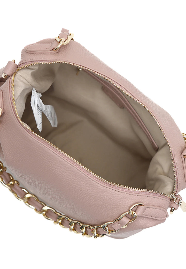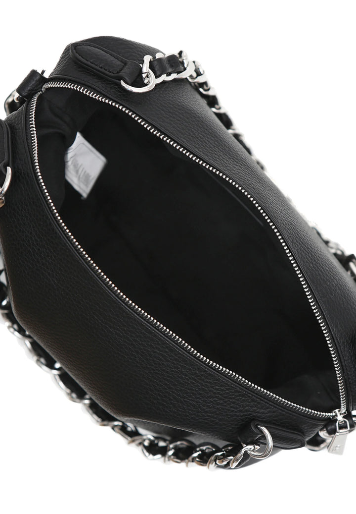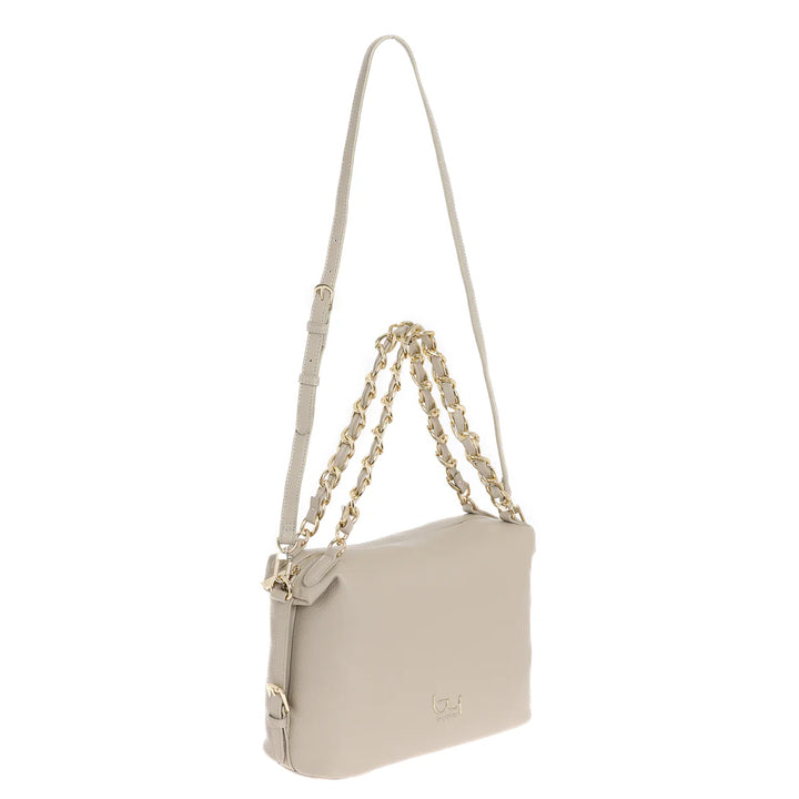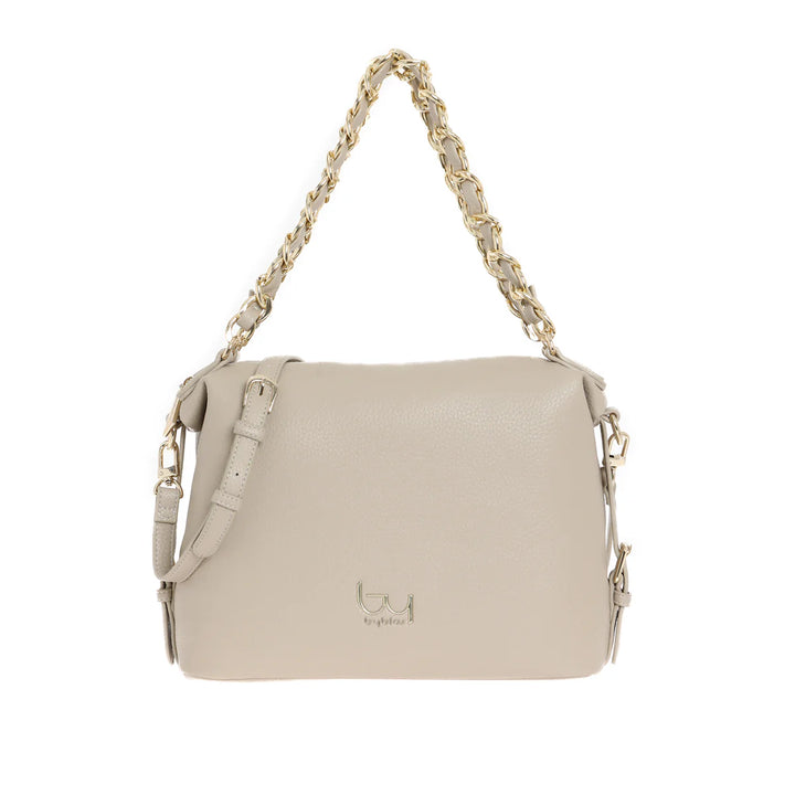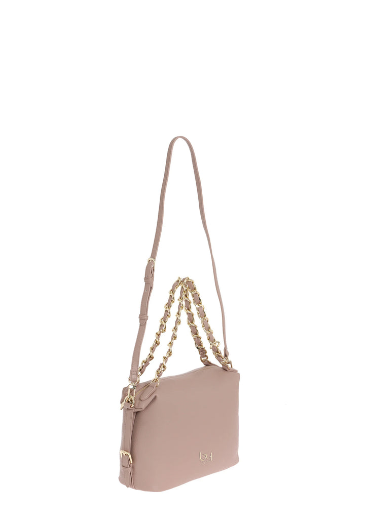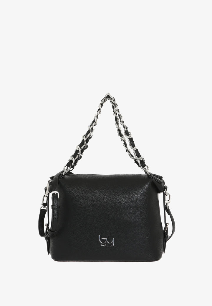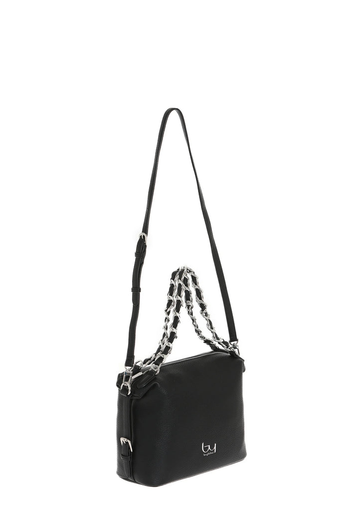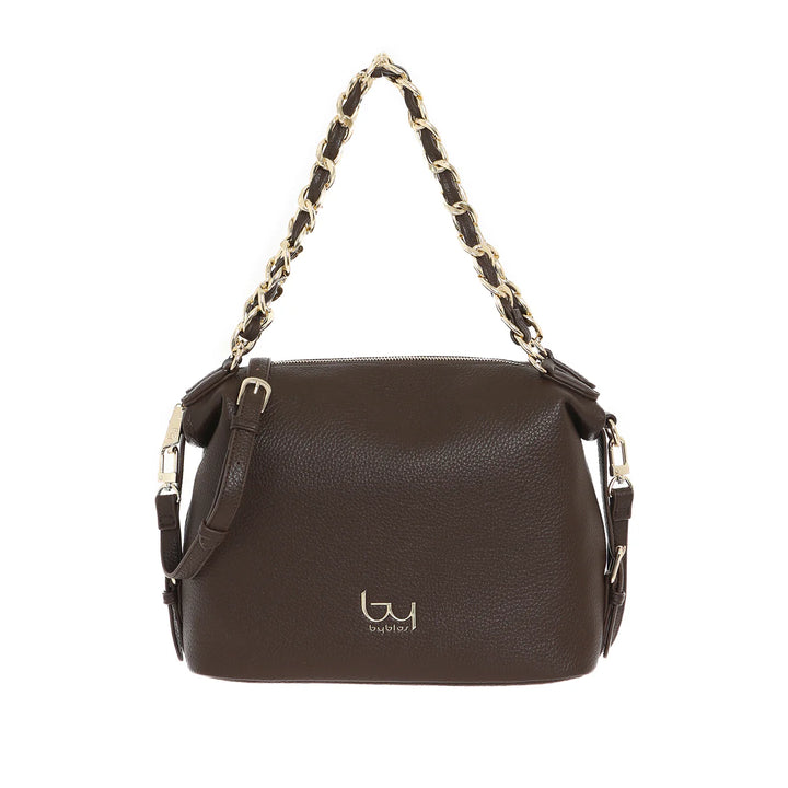 Borsa a spalla da donna By Byblos in ecopelle con logo metallico frontale e dettaglio fibbie laterali. Chiusura scomparto principale con zip, doppi manici con inserto catena oro fissi e tracolla regolabile opzionale inclusa.