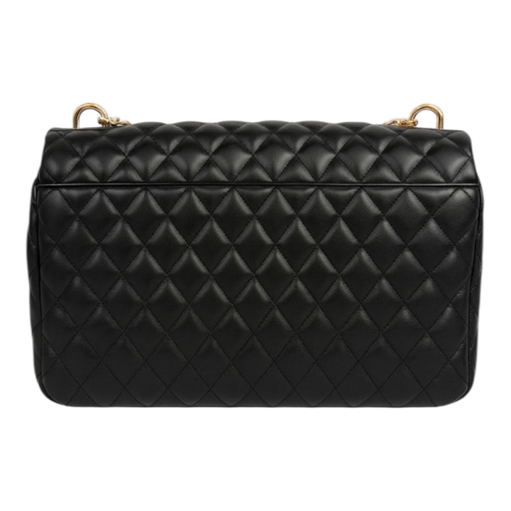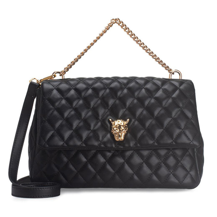 Borsa a spalla da donna RoccoBarocco in ecopelle trapuntata con applicazione accessorio pantera oro. Chiusura scomparto principale con zip e patta con clip magnetica. Manico corto catena oro fisso, tracolla regolabile opzionale inclusa.
