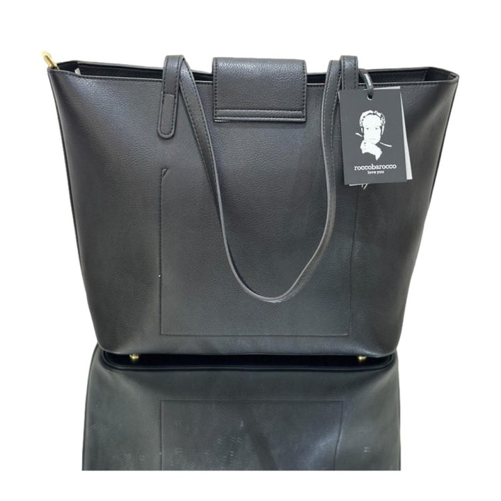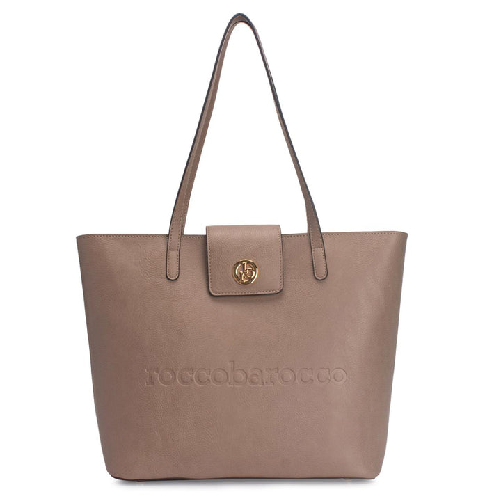 Borsa a spalla da donna RoccoBarocco modello shopper in ecopelle con logo frontale e dettagli in oro. Chiusura scomparto principale con zip e pattina con clip magnetica.