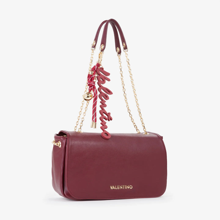 Borsa a spalla da donna Valentino in ecopelle con patta con clip magnetica. Logo frontale, ciondolo portachiavi gommato brand. Doppi manici con inserto catena oro fissi.
