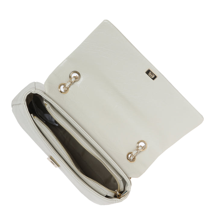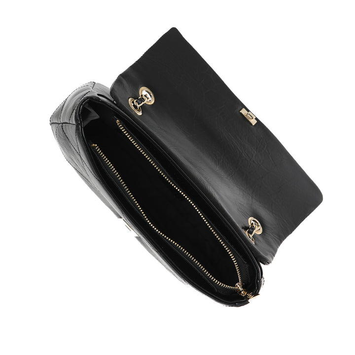 Borsa a tracolla da donna By Byblos in ecopelle trapuntata effetto stropicciato con patta. Logo metallico frontale, chiusura scomparto principale con zip. Tracolla con inserto catena oro fissa.
