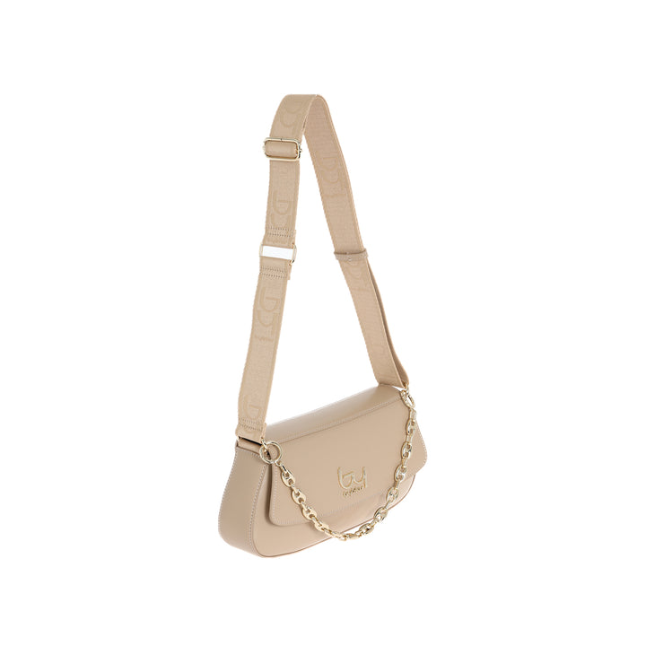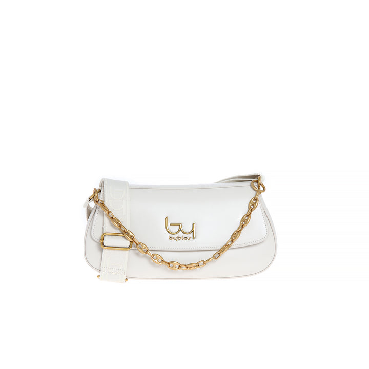 Borsa a spalla da donna By Byblos in ecopelle con patta liscia e logo metallico frontale. Chiusura scomparto principale con zip, manico corto in catena removibile. Tracolla a nastro logata regolabile inclusa.