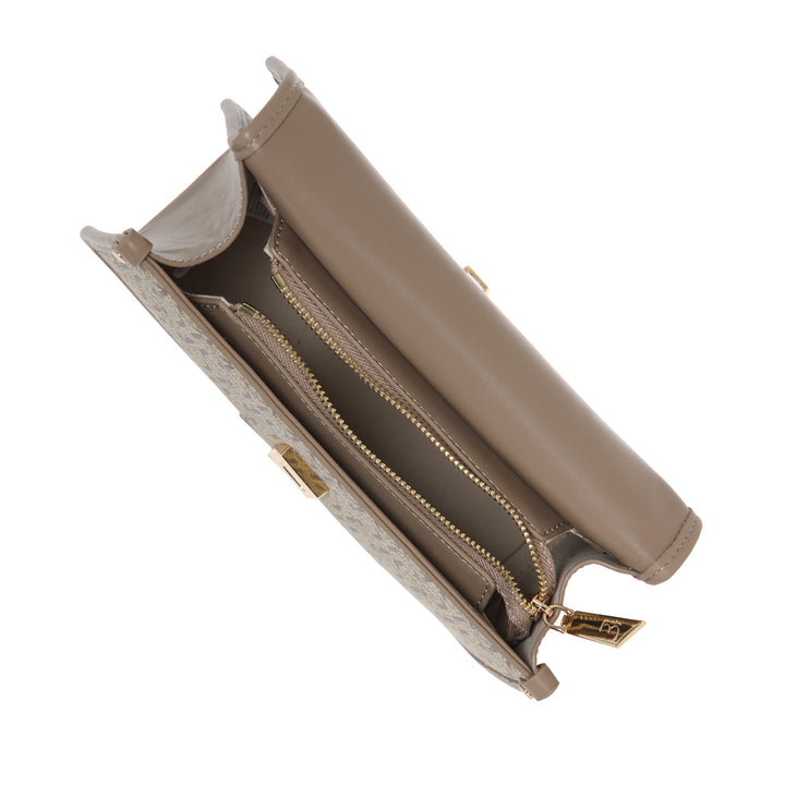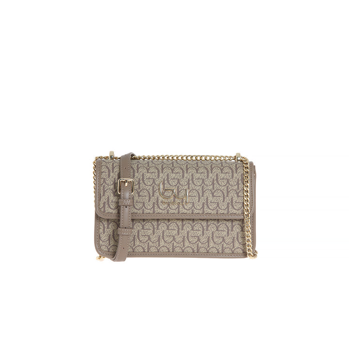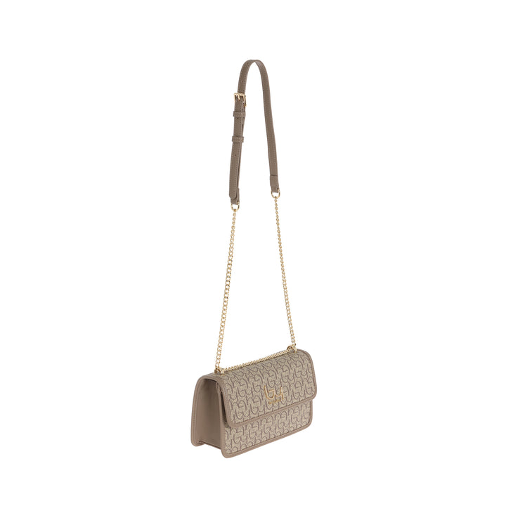 Borsa a tracolla da donna By Byblos in ecopelle fantasia logo all-overe applicazione logo metallico frontale, con patta. Chiusura scomparto principale con zip, tracolla con inserto catena oro regolabile.