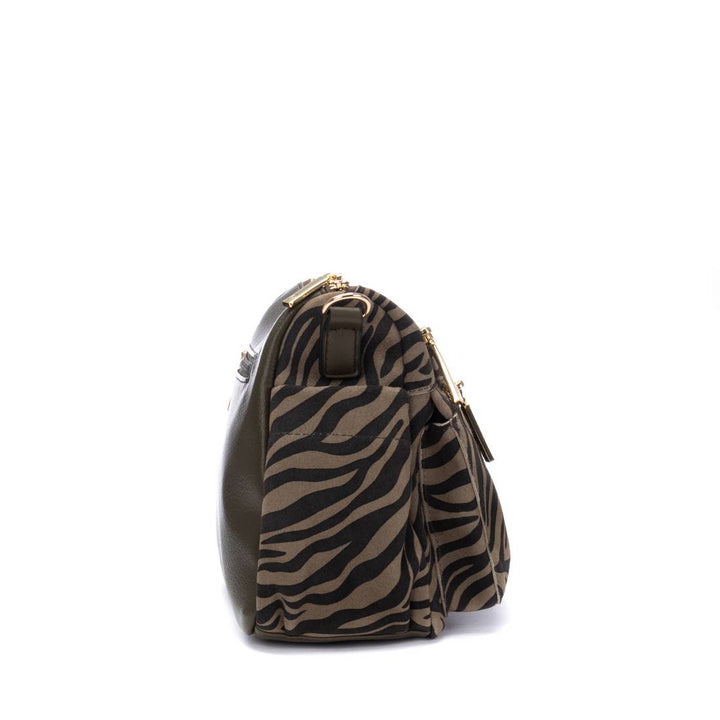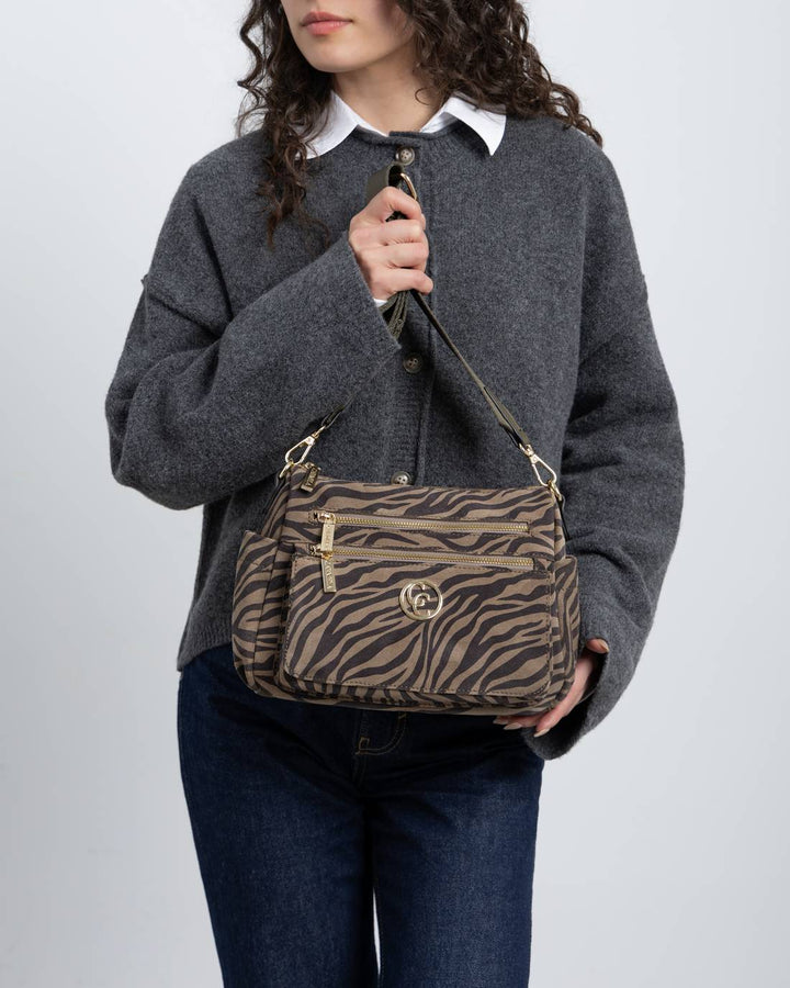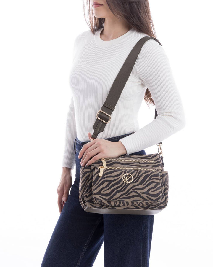 Borsa a tracolla da donna Carmela in pelle scamosciata con stampa animalier. Chiusura scomparto principale con zip, tasche anteriori con cerniera. Tracolla a nastro regolabile.