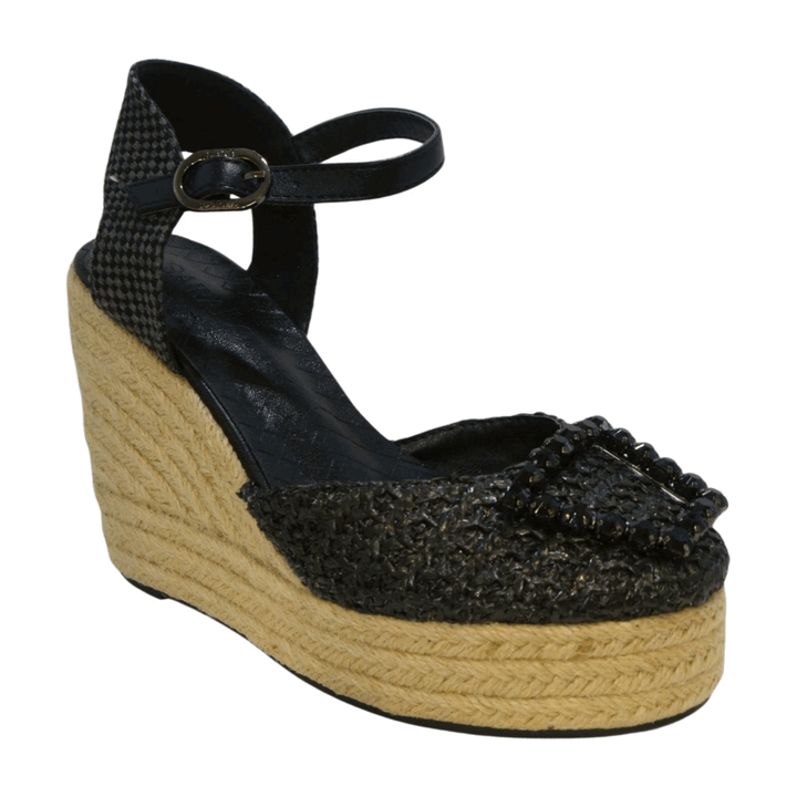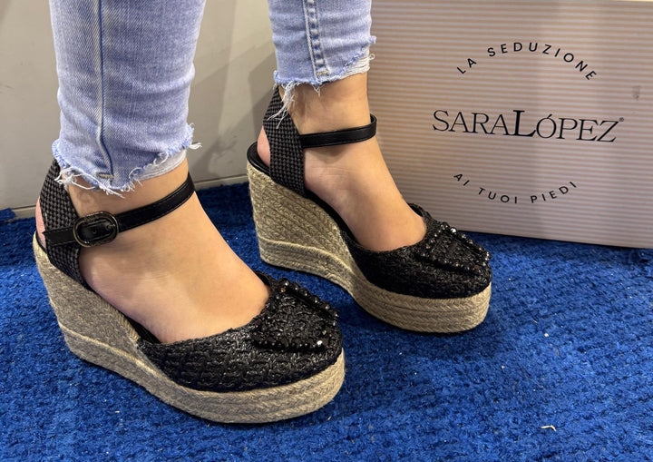 Campesina donna Sara Lopez in poliuretano nero con applicazione gioiello sulla punta. Chiusura con cinturino regolabile in ecopelle alla caviglia, plantare in pelle memory. Fondo zeppa ultra light in corda altezza 10.5 cm