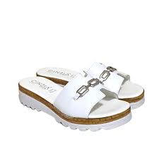Ciabatta Cinzia Soft a una fascia in pelle bianca con inserto catena cromata argento. Sottopiede morbido in pelle, fondo zeppetta con inserto effetto legno altezza 4 cm.