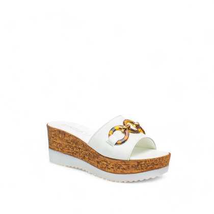 Ciabatta Cinzia Soft a una fascia in pelle bianca con applicazione effetto tartarugato. Sottopiede morbido in pelle, fondo zeppa in sughero altezza 6.5 cm e plateau altezza 3.5 cm
