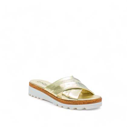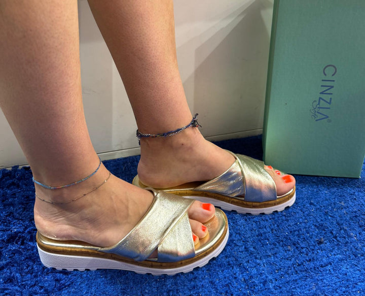 Ciabatta Cinzia Soft con morbide fasce a incrocio in pelle laminata oro. Sottopiede morbido in pelle, fondo zeppetta con inserto effetto legno altezza 4 cm.