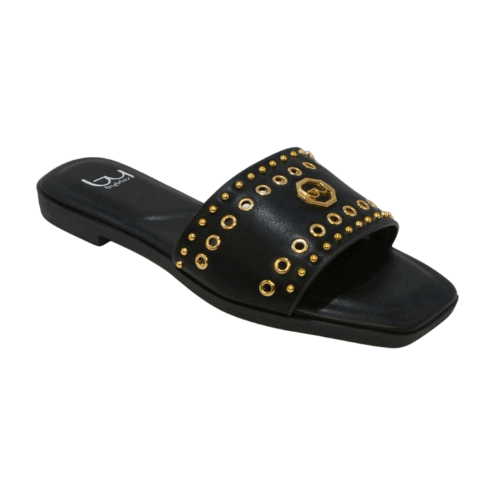 Ciabattina flat by Byblos in ecopelle nera con logo e borchiette oro. Sottopiede ecopelle in memory foam, fondo gomma con tacco a blocchetto altezza 2 cm.