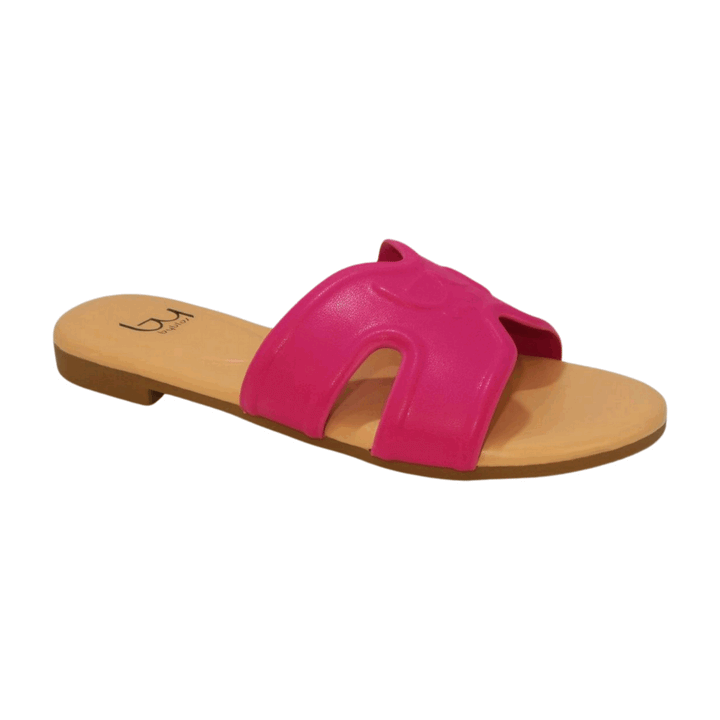 Ciabattina flat by Byblos in ecopelle con fascia gommata fuxia con logo a rilievo e sottopiede a contrasto nude in memory foam. Fondo gomma con tacco a blocchetto altezza 2 cm.