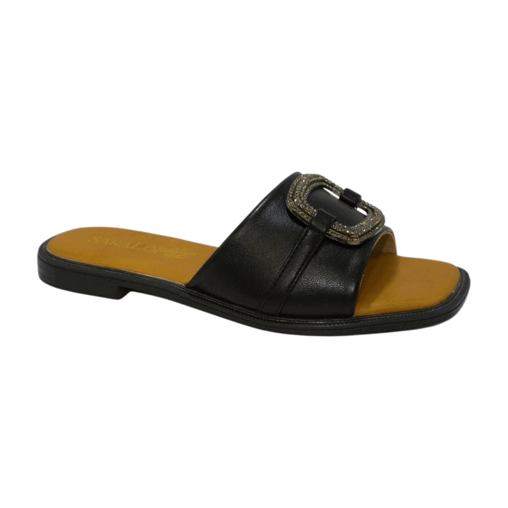 Ciabattina flat Sara Lopez con fascia in ecopelle nera e applicazione con strass in tinta. Sottopiede morbido, fondo gomma con tacco a blocchetto altezza 2 cm.