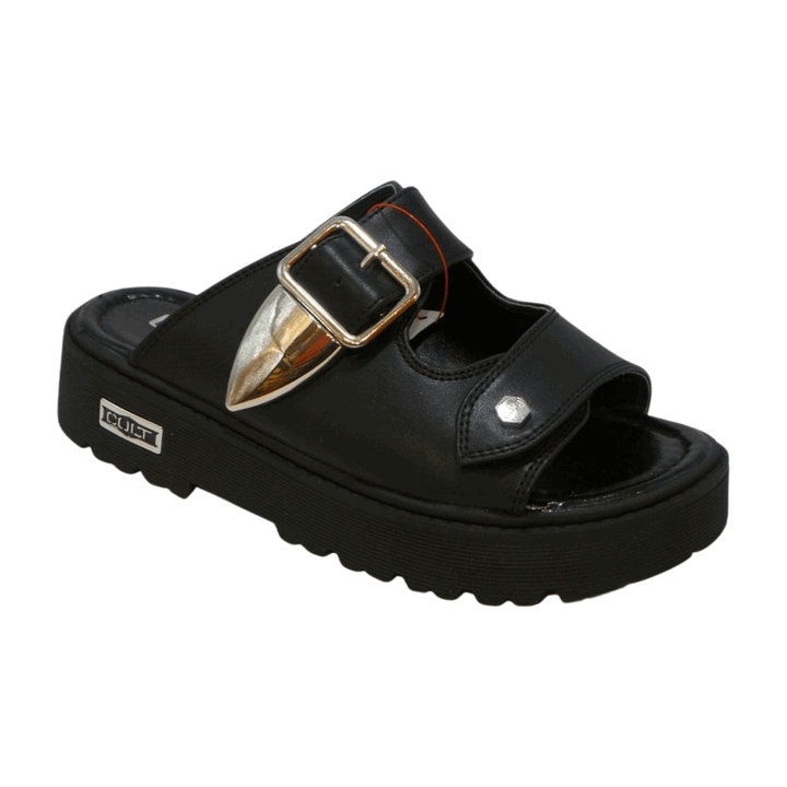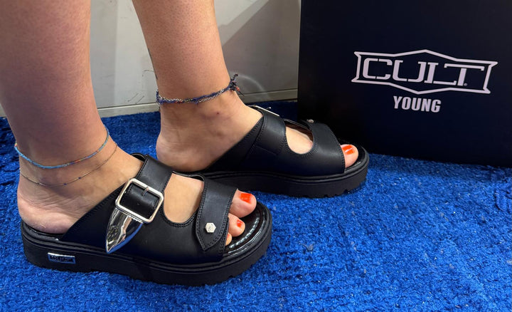 Ciabattone Cult Young in ecopelle total black con dettagli cromati silver, con doppie fasce regolabili. Sottopiede morbido in pelle, fondo logato in gomma platform altezza 4 cm.
