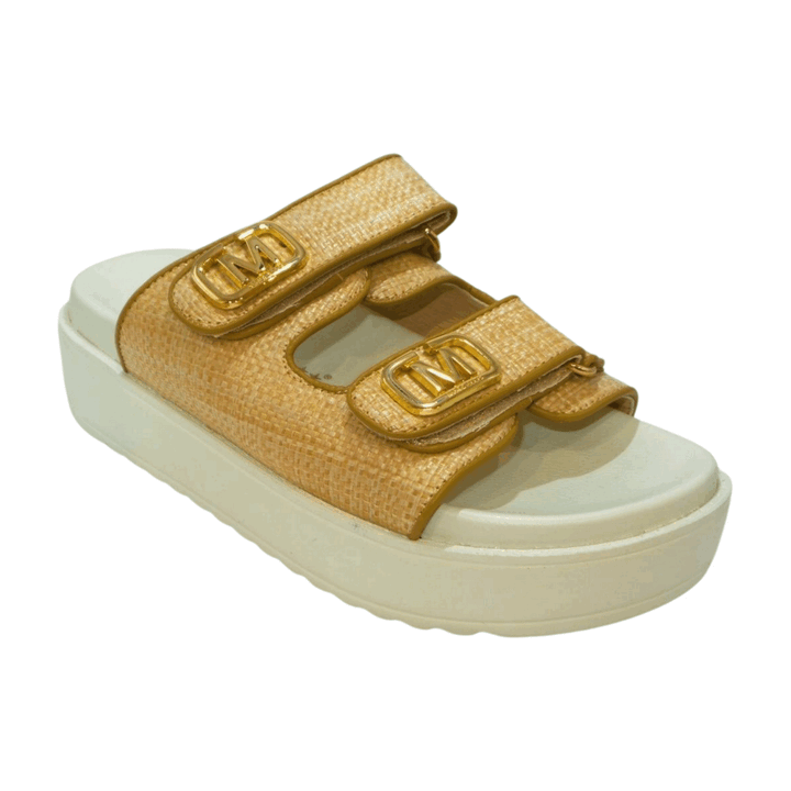 Ciabattone Marc Ellis in ecopelle effetto raffia beige a due fasce regolabili con placchetta logo dorata. Sottopiede morbido, fondo in gomma platform altezza 5.5 cm