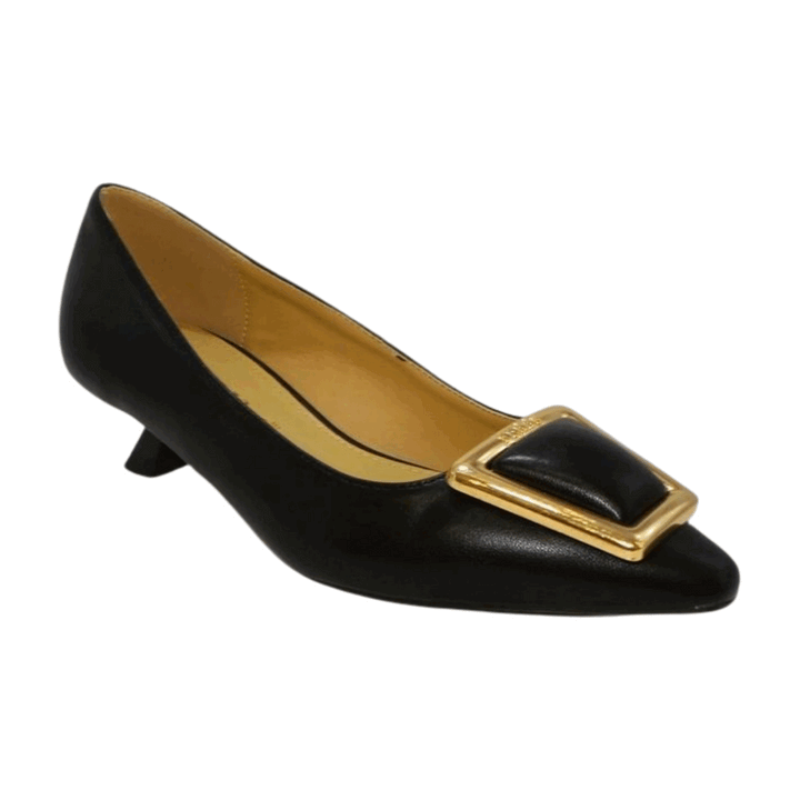 Décolleté ferré in ecopelle nera con fibbia oro logata sulla punta. Sottopiede morbido in pelle, tacco a rocchetto altezza 4 cm.