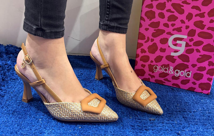 Slingback gold&gold in ecopelle camel e raffia multicolor con applicazione sulla punta. Chiusura posteriore con fibbia regolabile, sottopiede morbido in pelle. Tacco a rocchetto altezza 9 cm.