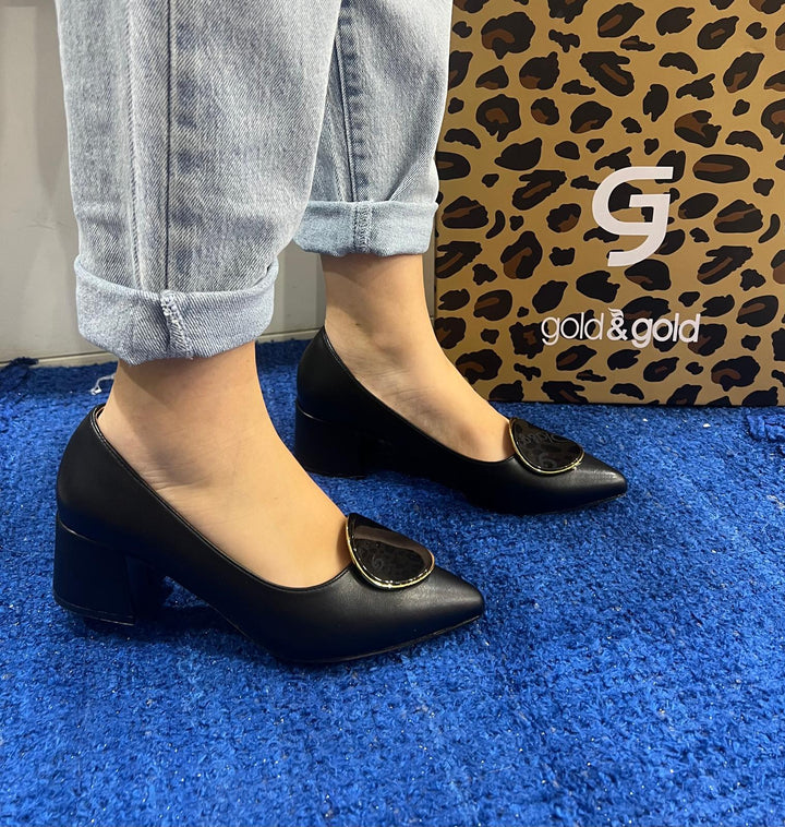 Décolleté gold&gold in pelle nera con applicazione sulla punta. Sottopiede morbido in pelle, tacco largo altezza 5 cm.