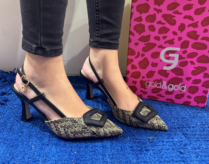 Slingback gold&gold in ecopelle nera e raffia beige con applicazione sulla punta. Chiusura posteriore con fibbia regolabile, sottopiede morbido in pelle. Tacco a rocchetto altezza 9 cm.