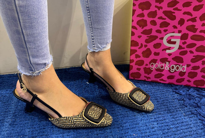 Slingback Gold&Gold in ecopelle nera e raffia beige con applicazione sulla punta. Chiusura posteriore con fibbia regolabile, sottopiede morbido in pelle. Tacco a rocchetto altezza 6 cm.