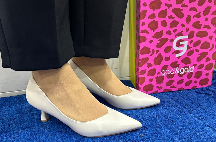 Décolleté gold&gold in ecopelle bianco sporco. Sottopiede morbido in pelle, tacco a rocchetto altezza 6 cm.