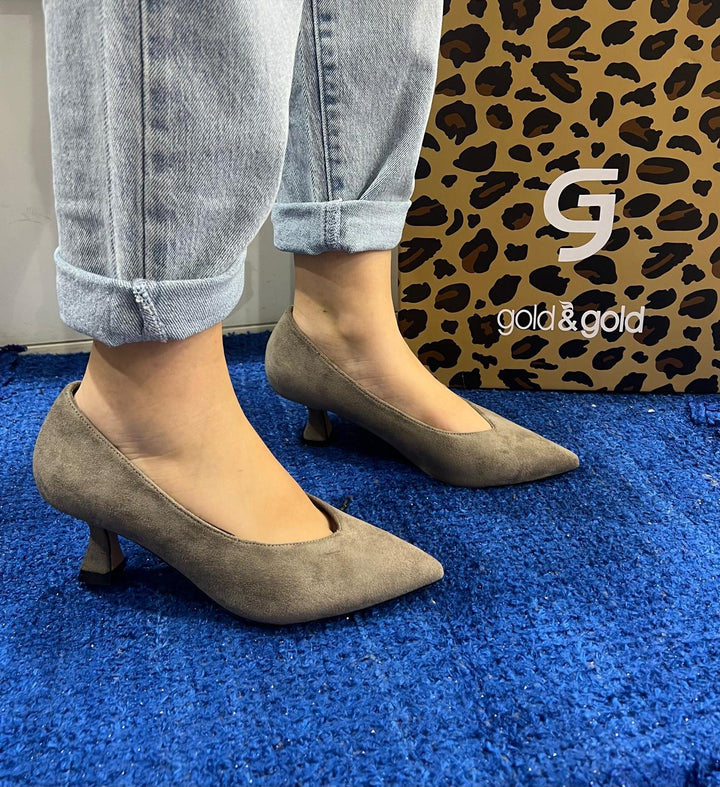 Décolleté gold&gold in camoscio taupe. Sottopiede morbido in pelle, tacco a rocchetto altezza 6 cm.