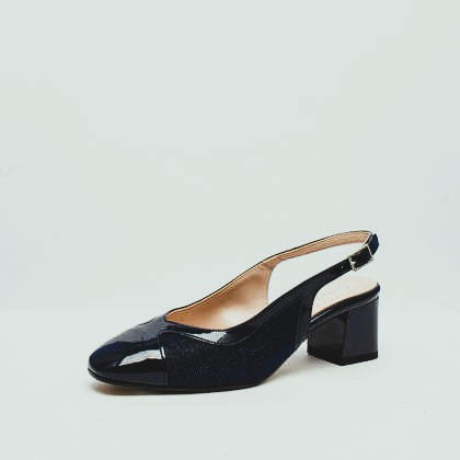 Slingback Cinzia Soft in tessuto lurex nero vernice nera, sottopiede morbido in pelle. Chiusura con fibbia regolabile, tacco largo altezza 5.5 cm