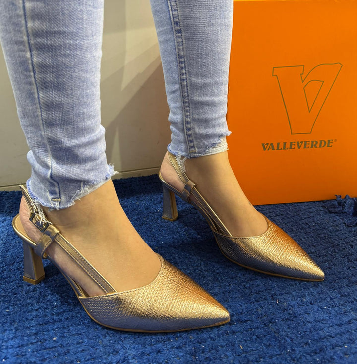 Slingback Valleverde in ecopelle martellata effetto lamé. Chiusura posteriore con fibbia regolabile, sottopiede morbido in pelle. Tacco a rocchetto altezza 8 cm.