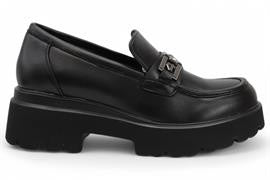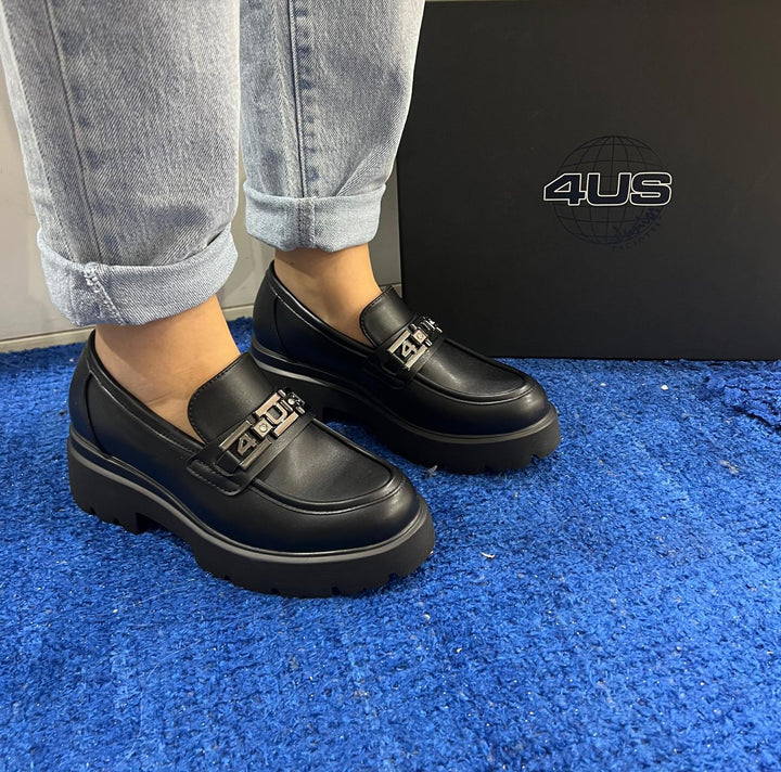 Mocassino donna 4US by Cesare Paciotti in ecopelle total black con placchetta logo sul passante e sottopiede morbido in pelle. Fondo gomma, battistrada dentellato con tacco separato altezza 5 cm.