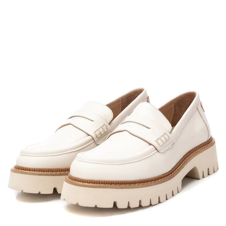 Mocassino donna Carmela in pelle sfoderata bianco sporco effetto invecchiato. Sottopiede in pelle comfort foam, targhetta logo sulla talloniera. Fondo gomma leggero con battistrada dentellato, tacco separato altezza 4 cm.
