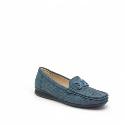 Mocassino donna Cinzia Soft in nabuk laserato blu navy con applicazione catena sul passante. Sottopiede in ecopelle morbido, fondo zeppa in gomma leggero altezza 2 cm.