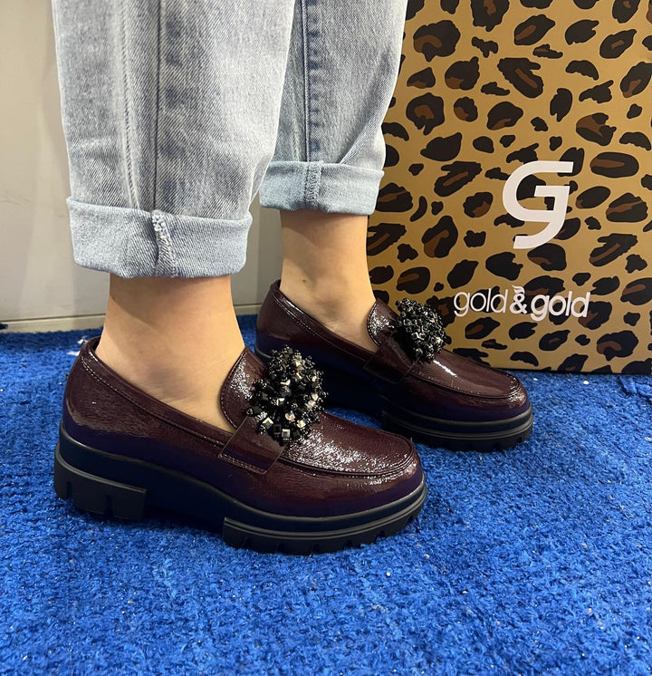 Mocassino donna gold&gold in vernice bordeaux con maxi applicazione sul passante. Plantare estraibile in comfort foam, fondo platform in gomma altezza 5 cm.
