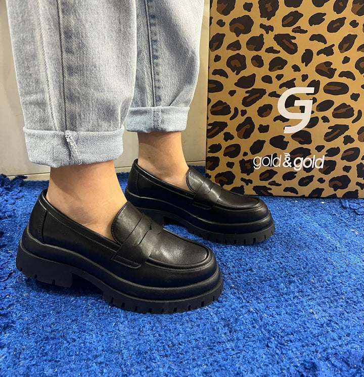 Mocassino donna gold&gold in pelle nera. Plantare in pelle estraibile in comfort foam, fondo gomma con tacco separato altezza 5 cm e battistrada dentellato.