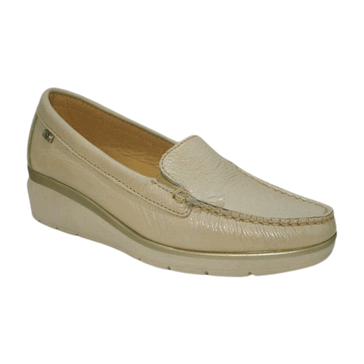 Mocassino donna Valleverde in pelle avorio con impunture a vista. Sottopiede in pelle morbido, fondo zeppa in gomma ultra leggero altezza 4 cm.