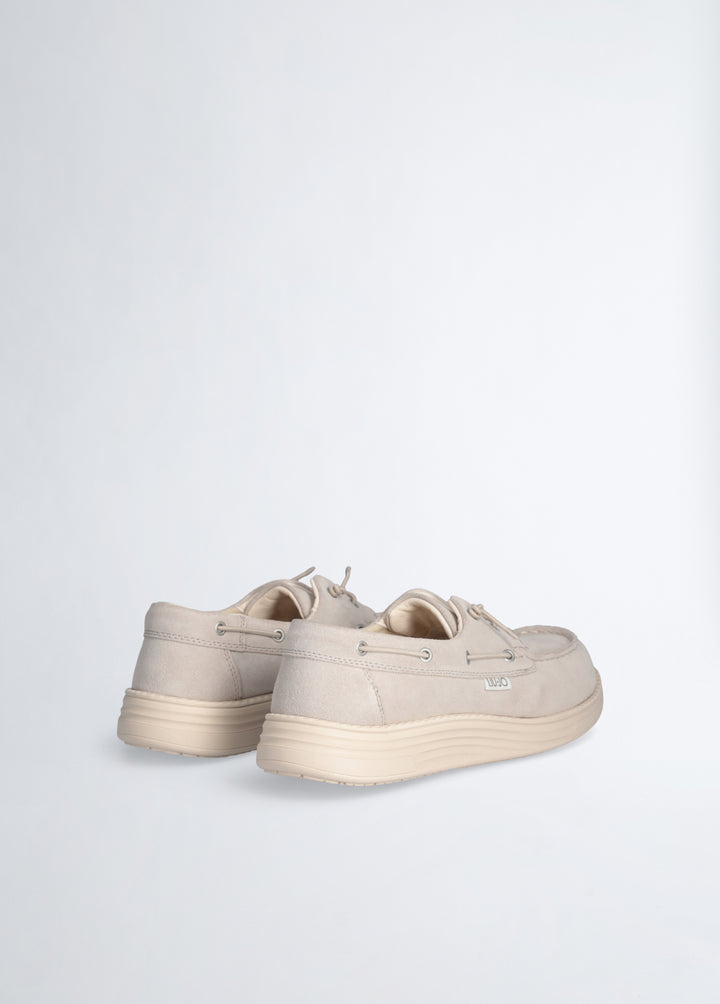 Mocassino Liu Jo d'ispirazione sailing in camoscio soft beige con patch logo laterale. Lacci elastici in tinta, suola antiscivolo e fondo eva ultra light altezza 3.5 cm