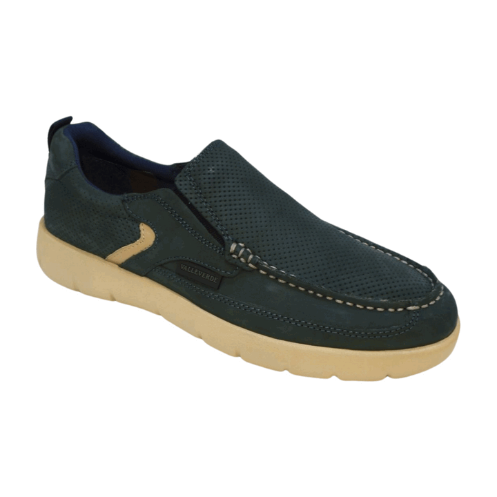 Mocassino uomo Valleverde in nabuk effetto laserato blu navy con impunture a contrasto. Tomaia interna e plantare removibile in pelle. Inserti elastici laterali. Fondo gomma ultra light altezza 3 cm.