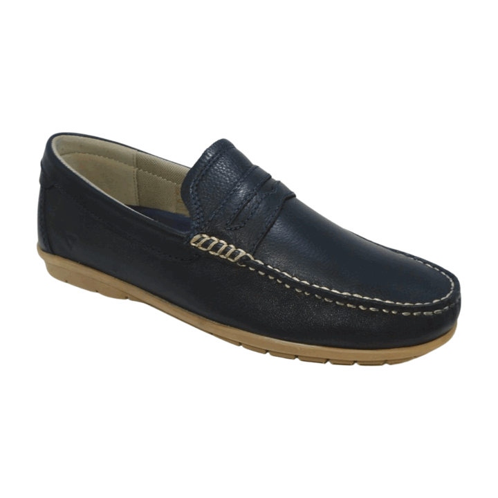 Mocassino uomo Valleverde in pelle blu con impuntire a contrasto. Tomaia interna e plantare removibile in pelle in memory foam. Fondo gomma altezza 2 cm