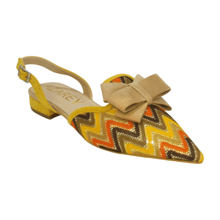 Sandalo basso con punta Azarey in tessuto stampa zigzag sui toni caldi. Maxi fiocco in camoscio color taupe e cinturino posteriore giallo ocra regolabile. Plantare in pelle comfort foam, fondo gomma con tacco a blocchetto altezza 3 cm.