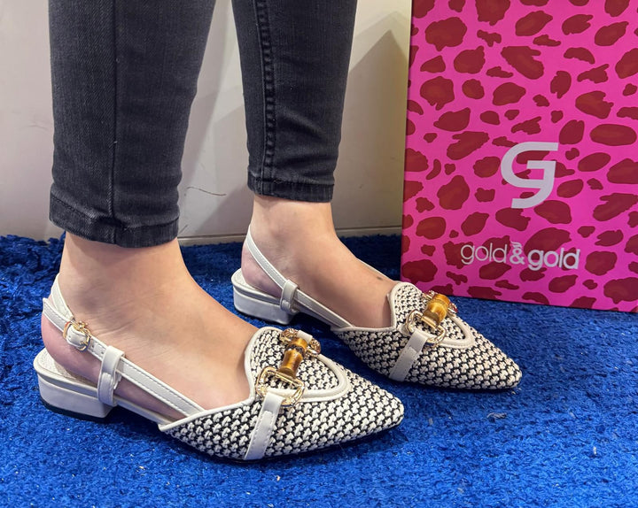 Sandalo basso donna gold&gold in ecopelle bianca effetto raffia bicolor con applicazione staffa cromata oro e inserto bamboo sulla punta. Chiusura posteriore con fibbia regolabile, sottopiede morbido in pelle. Tacco a blocchetto altezza 3 cm.