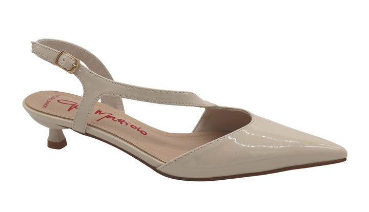Sandalo basso a punta Love to Love Gai Mattiolo in vernice beige con cinturino trasversale e chiusura alla caviglia. Plantare in pelle comfort foam, fondo in gomma con tacchetto a rocchetto 4.5 cm